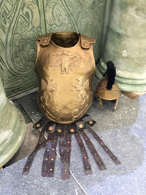 A costume designed and made by Anna Alcock. The costume is made from fibreglass and was constructed using plaster casting techniques. The pieces were painted using metal effect paints and embellished with latex emblems.